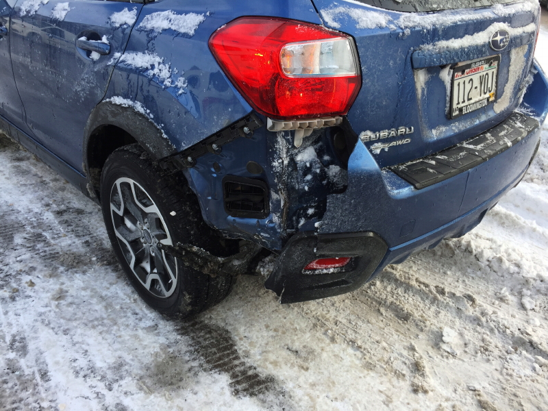 In my case, I spotted the vehicle in front of me struggling with loss of grip and immediately began working my car to a stop without hitting anyone. My Crosstrek came to rest at a 45° angle to the lane. I barely had time to gloat over my deft maneuvering before the car behind me made solid impact.