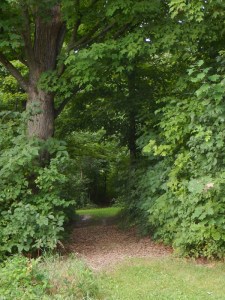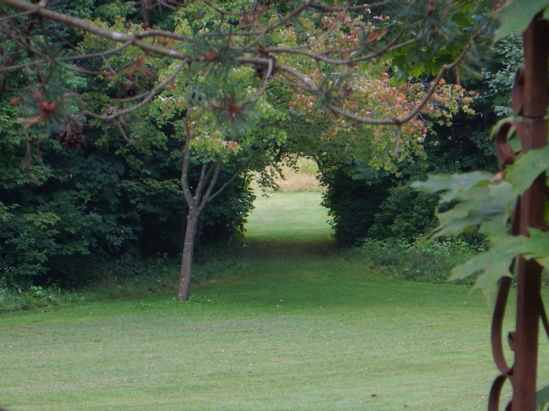 Stepping through this last opening brings you to the entrance to our Rowcliffe Forest Garden Labyrinth, a large 11-circuit Chartes labyrinth. It lies just out of sight to the right of the opening, which I think makes this portal the most enticing of all.