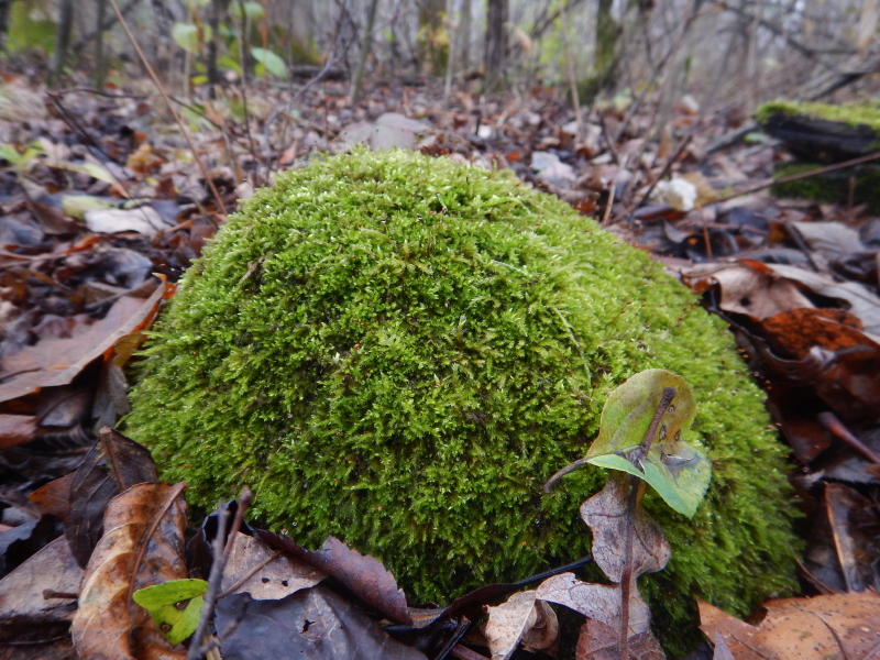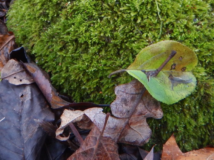 I was looking at this moss-covered rock in our woods and decided to take some pictures of it. I don’t recall noticing the leaves around it, but after transferring the images to my computer, it is the leaf pierced by the stem of another leaf that leaps out of the image for me.