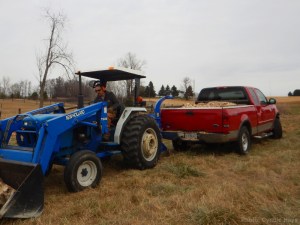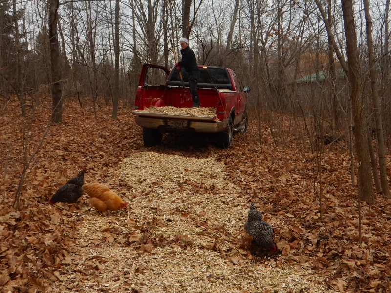 The chickens show no sign of needing time to adjust. They showed up instantly when we drove to one of our trails to distribute a load of wood chips. I think they wanted to help spread them around.