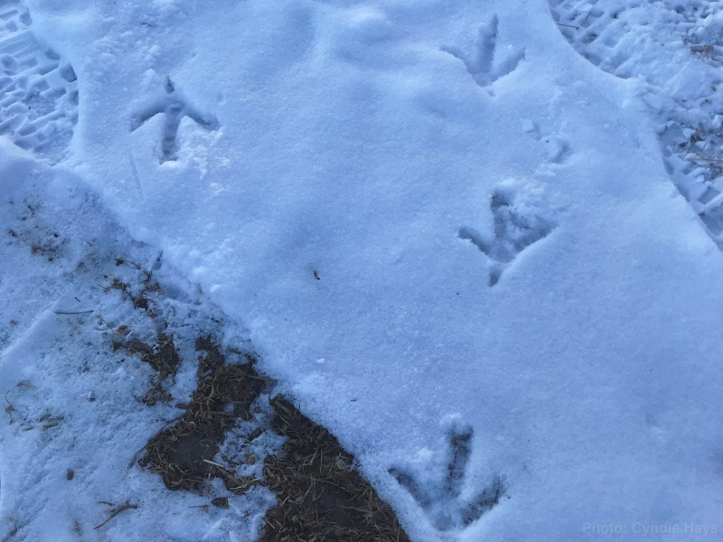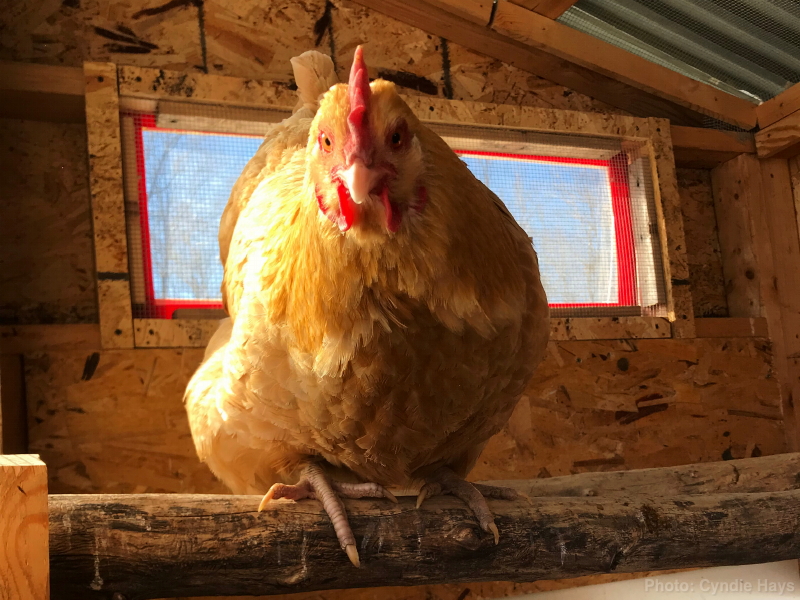 When it gets extremely cold, the chickens tend to stay put all day in their coop, but some days they surprise us and venture out anyway. This week, Cyndie reported, one day it was the Buff Orpington making the trek to the barn overhang, and the next, it was the two Barred Plymouth Rock hens.