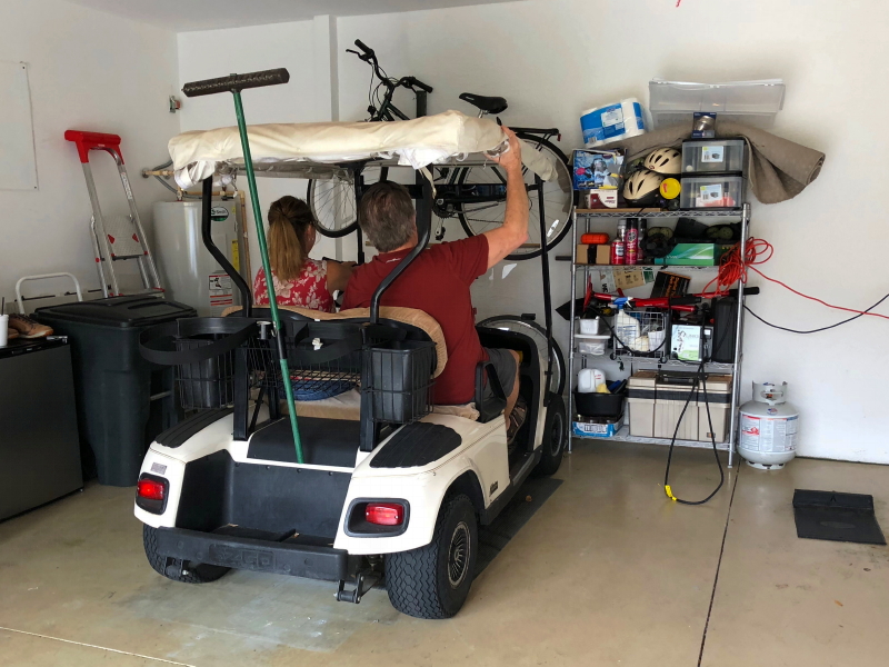 Cyndie was behind the wheel with Mike holding on for dear life. It looks like they were coming in hot and she stopped just in time, but she was actually about to back out for an excursion down to the bocce courts.