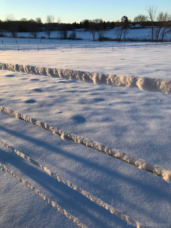 The snow that had stuck to the wires of our fence was blowing off in long chunks and creating the lines on the surface below.