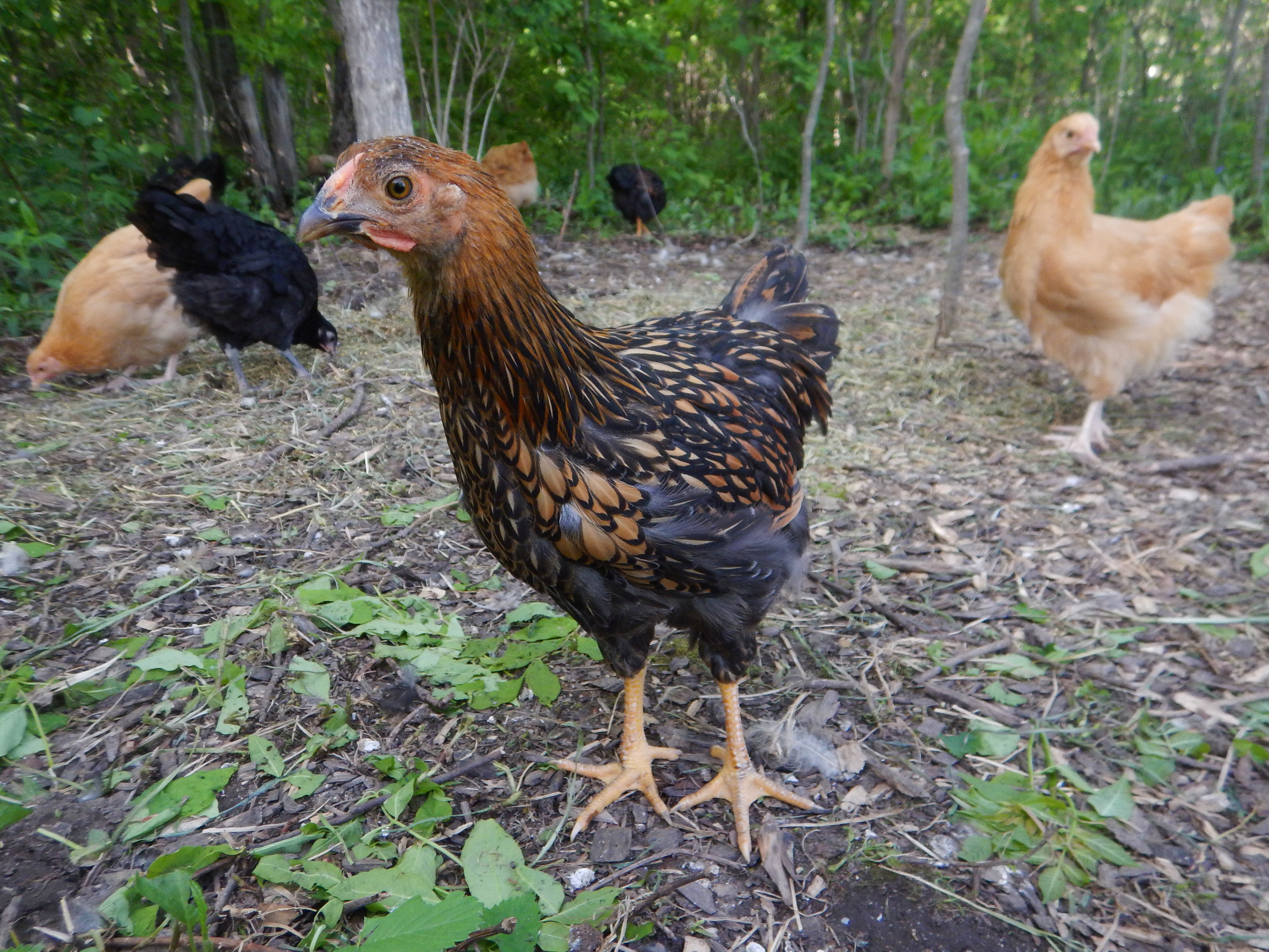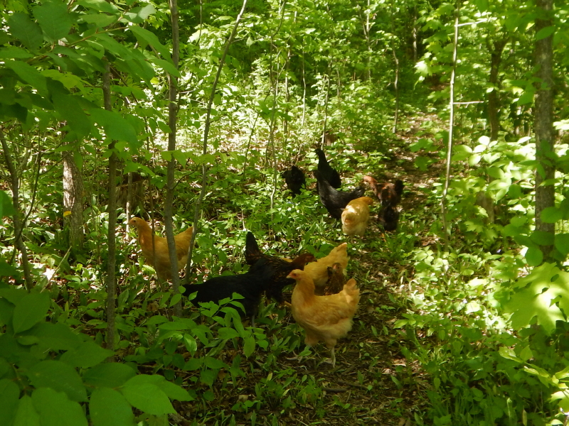 Boy did the chicks have fun. They romped to and fro through the woods, eventually stumbling on the composting piles of manure. Their next move was back into the thick growth on the edge of the woods, but at least in the right direction, toward the coop.