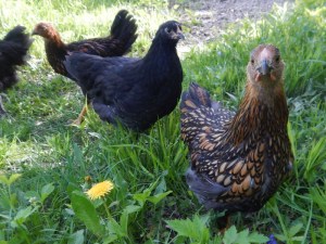At dusk, Cyndie found them all in the coop, although reporting the good news with frustration that they still are showing no interest in roosting. I’m hoping that natural chicken instinct will get them up there eventually. Last year’s young coop residents needed no encouragement to seek the highest possible perch.