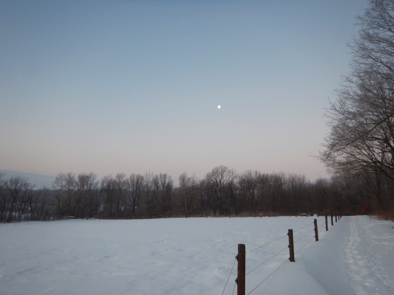 Walking Delilah anywhere other than on the driveway now requires snowshoes. Even then, the blowing snow has filled in many of our previous paths to the point of oblivion, and I had to abort a plan of trekking around the outside of the hayfield, because it was too much work fording the deep snow.