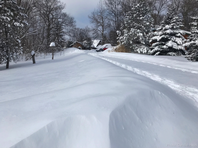 It didn’t start snowing until after dark Saturday night, but Cyndie said it was coming down pretty heavily when she took Delilah out for her last walk of the night. When I got up in the wee hours of the morning, the wind was whipping the snow to the point it completely covered the screen door to the deck so I couldn’t guess how much new snow had fallen to that point.