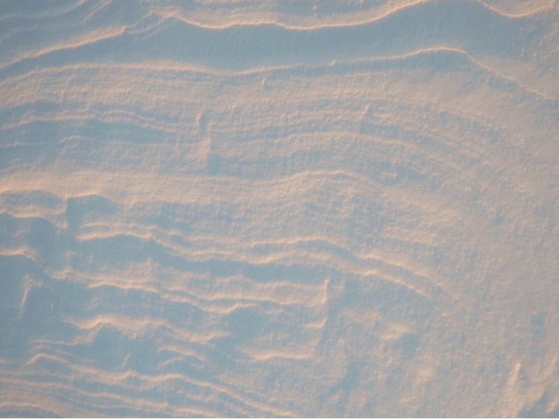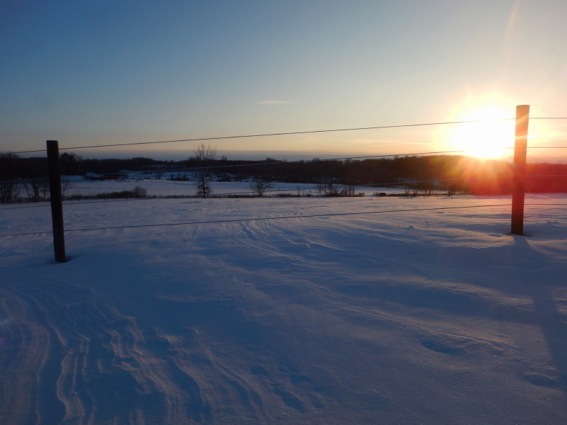I was granted the honor of walking our trash and recycling bins down to the road with Delilah yesterday, and at the high spot of the driveway, beside the hay-field, we paused to take in the sunset, as well as the line sculptures getting carved in the snow by the bitter wind.