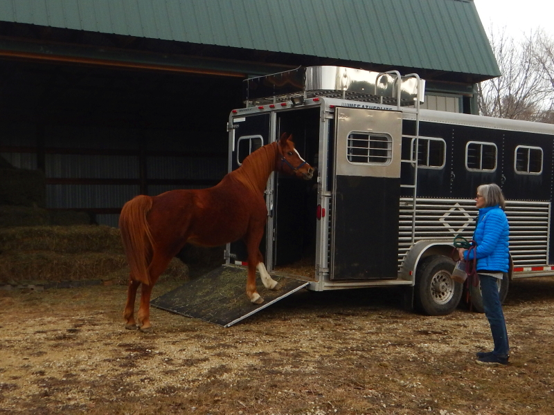 Cayenne was understandably cautious, but eventually made it all the way to the front position inside the trailer, remaining calm while Hunter whinnied from the barn. His turn came next.