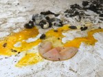 Yesterday, Cyndie found that an egg failure didn’t even make it to the nest box. The poop board under the roost held evidence of an egg-saster.