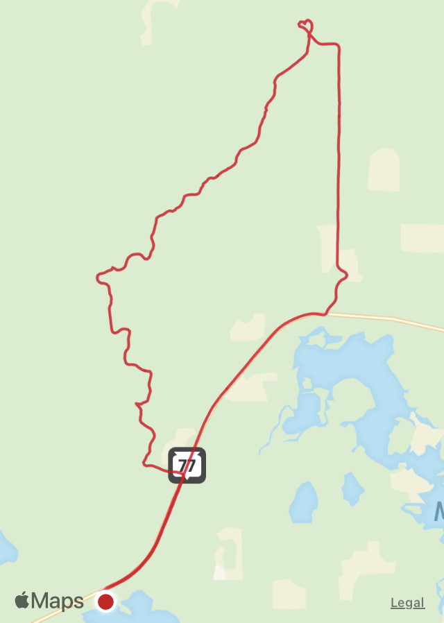 From there, we could roll the pavement of one of our favorite wooded roads back to Highway 77 and ultimately the driveway of Wildwood. The sections of trail and pavement are relatively obvious in the depiction from my ride-tracking app. The cute little heart shape at the top was unplanned.