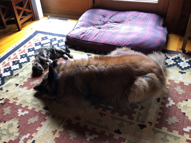 It doesn’t happen often, so I hastily grabbed my phone to capture the moment yesterday afternoon when cat and dog weren’t behaving like cantankerous siblings. Who swapped our pets for well-behaved lookalikes?