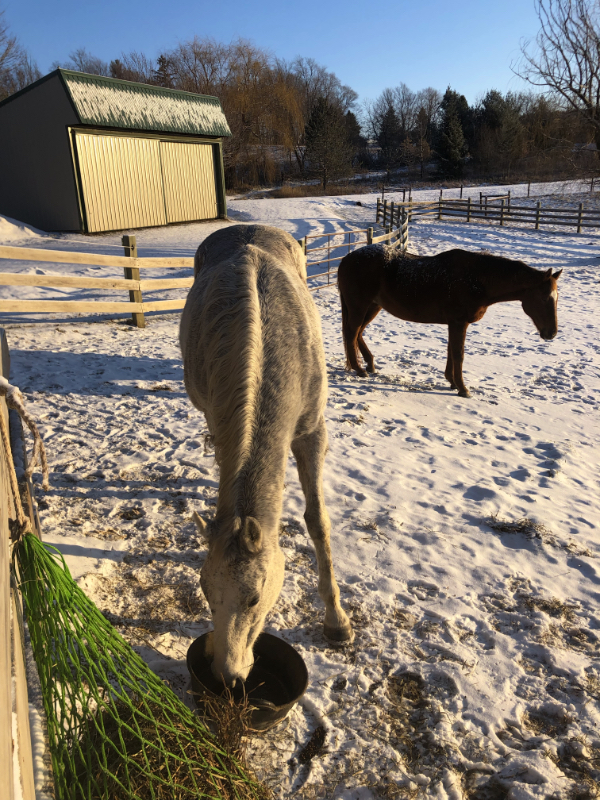 In the time since I returned to the house and finished my own breakfast, the sky has become overcast. At this point, the horses are more inclined to lay down and roll around to knock the melting snow blankets off their backs.