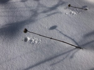 There is a new covering of snow that has created a fresh surface for our forest creatures to make their marks upon. I’ve gotten no better over the years at differentiating the identity of the range of little footprints made by squirrels, rabbits, chipmunks, moles, and mice, but I know all of them are out there running around.
