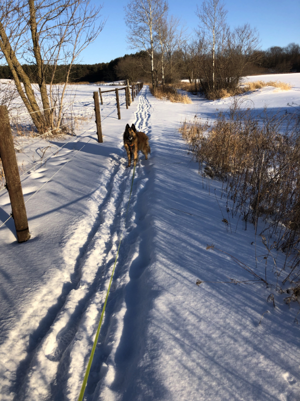 In the last week, we have received a series of overnight snowfalls when the temperature has been very cold, bringing an inch or two of light powder each time, which has been enough that the trails we walk have needed to get re-packed every other morning. If we were to walk down the middle all the time we would end up with a rather narrow “aisle” of travel through the accumulating snow cover, so I make a concerted effort to walk the edges after new snow in order to keep the packed path nice and wide.