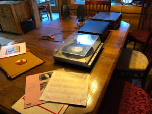Cyndie authorized use of the dining room table for a temporary setup of the old turntable so I could spin some of the more unique albums she is looking to get rid of soon.