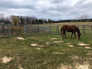 After that, I spent time scooping old remains of manure left from the time we allowed them to be in there over winter. By the time I was done, it was the normal hour for their feed pans to be served. While they finished that and then munched on some hay, I pushed the wheelbarrow across the paddock and scooped manure. When I was near the gate to the round pen, I undid the chain and opened it up to provide them clear access.