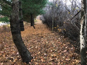 We ended up with a pleasing alleyway between the pine trees and the wall of tangled branches along the property line. My goal, as always along this stretch of our northern border from the road up to the shop garage, is to continually trim back new growth until that thicket begins to look like a giant hedge delineating our property line.
