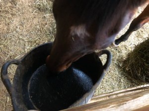 When circumstance has allowed, I have also experimented with changing who gets paired or switching to three horses on one side and one horse on the other. Since Mix and Mia both get the same-sized portion of feed, I like having them together on one side. Then I don’t have to care if any of the four try to switch.