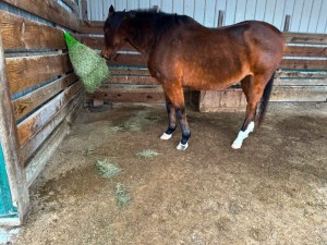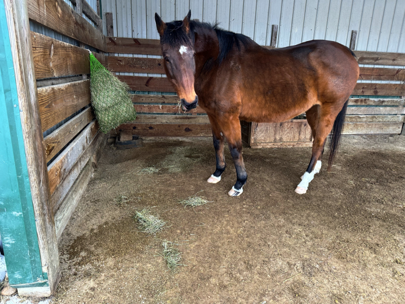 I had just filled a hay net that Swings moseyed up to for some post-feed pan noshing yesterday morning. After passing by to deal with other housekeeping around the overhang, I caught sight of all these bites already on the ground.