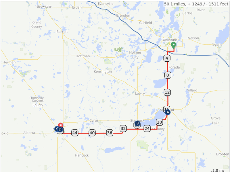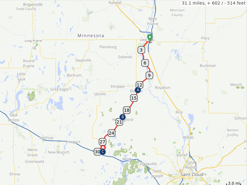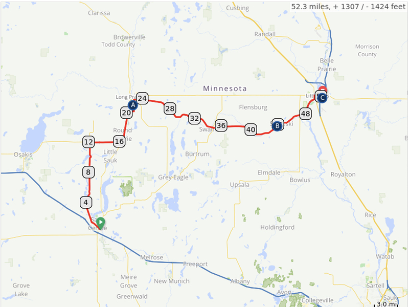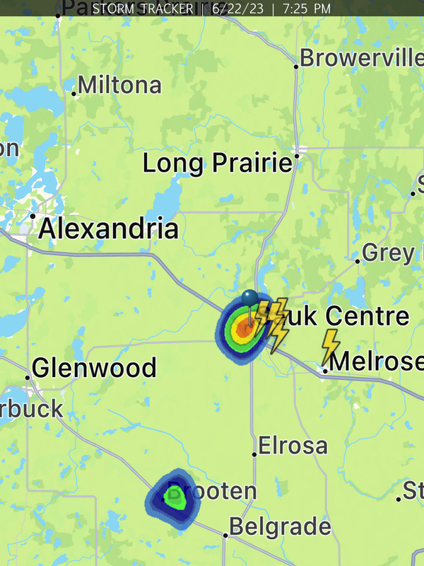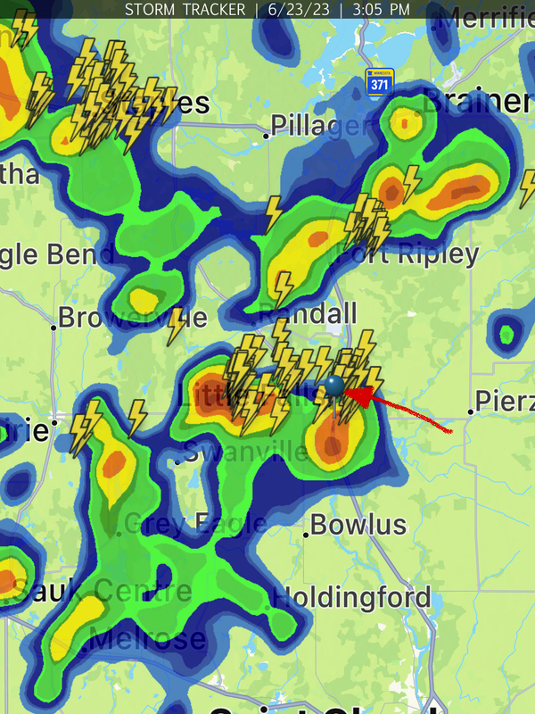 First, it happened in Sauk Centre and then the next day in Little Falls. If you can find the little blue dot pin in the images above, that shows our location each time. At least we were done riding by the time those downpours occurred.