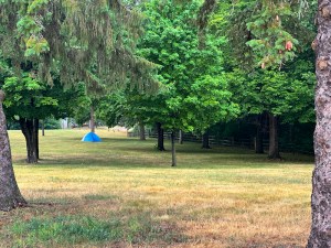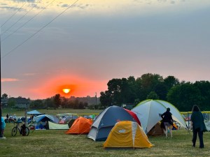 In trying to split the difference between authorized tenting location and shade from the sun, a bunch of us put our tents near the school in Alexandria. Lights from both inside and outside the school stayed on all night long. The picture above on the right was taken at 10 p.m. It was still that bright when I checked five hours later after my full bladder woke me. Luckily, bright light doesn’t stop me from falling asleep.