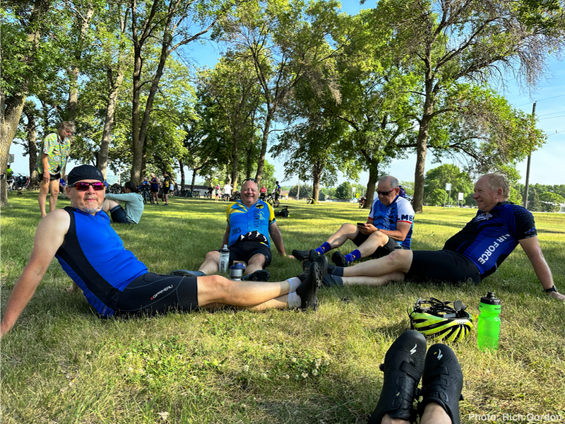 While on a pause from pedaling at a park in Glenwood, I noticed Tom, Rick, and Rod were all leaning back on their arms like I was. We were all mirroring each other. I handed my phone to Rich Gordon and asked him to take a picture. At the same time, Rick moved out of position to take a phone call. Close enough for me.