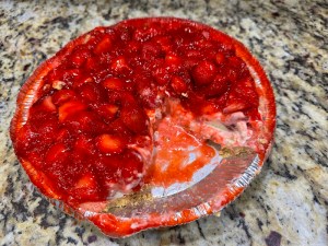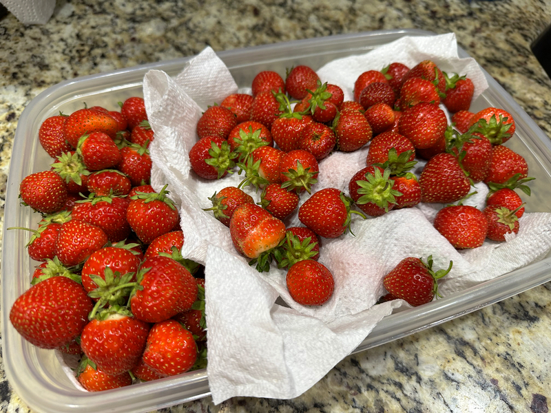 Cyndie’s strawberry patch is now producing fruit and doing so in quantities that have her plotting endless ways to use them. It’s a good thing we have freezer space because we already have more strawberries than we can eat. Not that we aren’t doing our best to consume massive quantities while they are fresh.