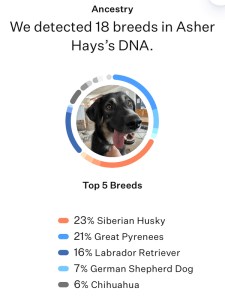 Asher is almost a quarter Siberian Husky. Cool! Followed closely by Great Pyrenees. Then comes the Lab and Shepherd we anticipated.