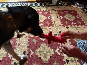 We have noticed that Asher gets upset when left alone and resorts to chomping on anything within reach. In his crate, that has meant ripping the beautiful tapestry draped over the top, annihilating the foam pad and its cover, and shredding parts of a sheet that replaced the tapestry. Our reaction for some time has been to limit the minutes he is left in isolation. Letting him roam free while she stepped outside for a few minutes was Cyndie’s experiment in helping him become comfortable with our comings and goings.