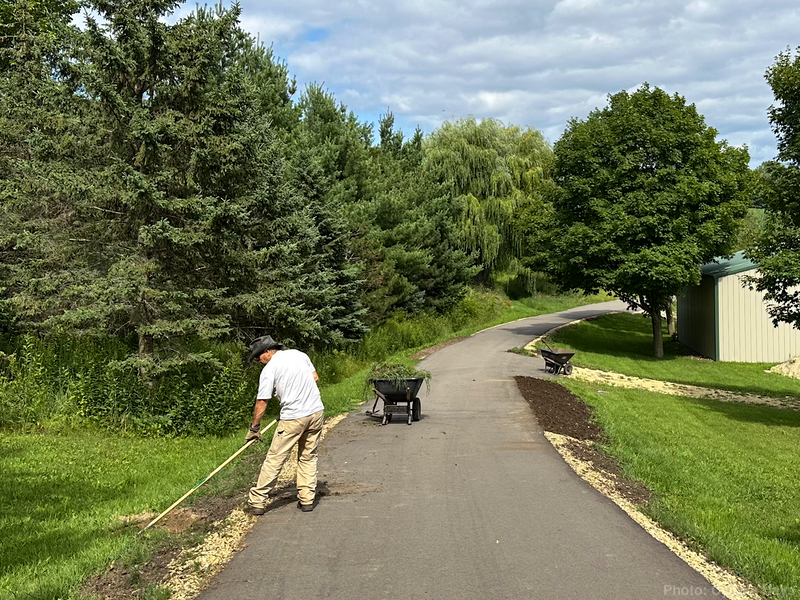 In the interim, we are taking a crack at applying an improvement to our original thinking about how to finish the edge of the driveway asphalt in the sections where we already tried smoothing the grade with some composted manure.