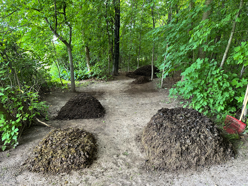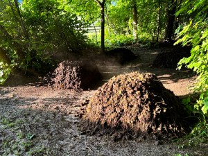 The pile just behind them is in the final stage of composting. Just beyond that one is an area shown in the second photo where I just removed two composted piles to use for the driveway landscaping project. In the background is a large pile that was created over the winter and never got turned in order to fully compost.
