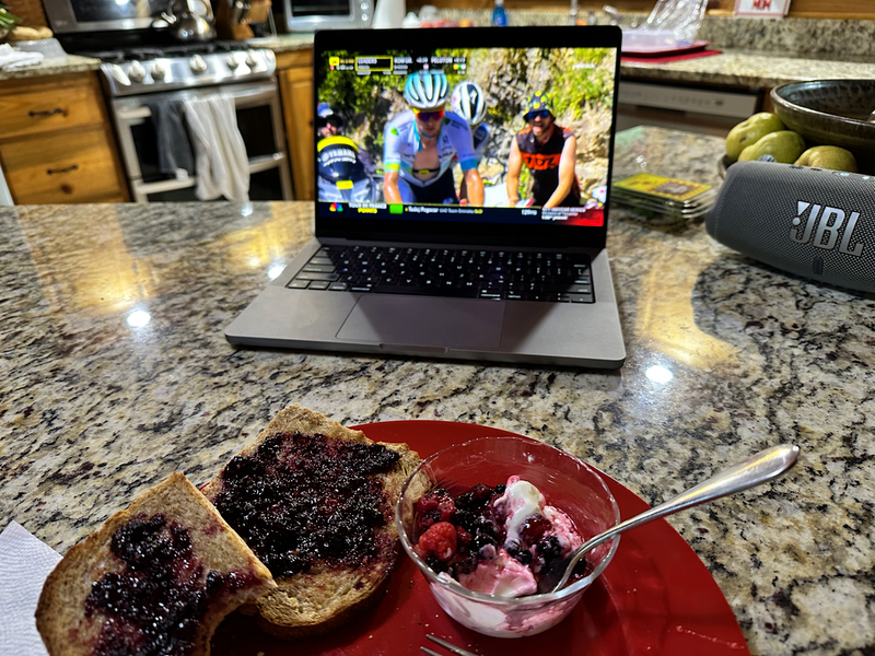 I’m soaking up the race while enjoying fresh-picked wild black raspberries on my yogurt with eggs and toast spread with Cyndie’s blackcap jam.