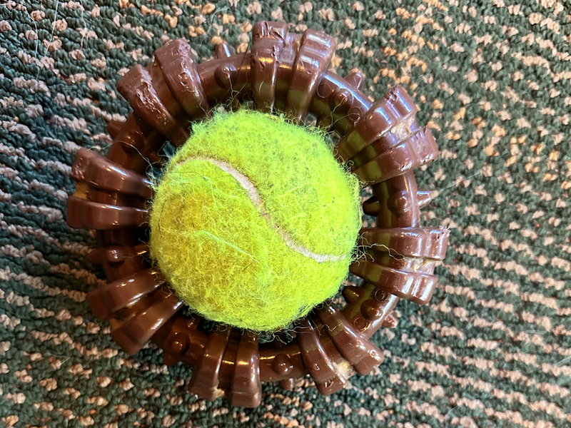 Beck devised a modified chew toy combination that has become my favorite. He forced one of the larger Kong balls in the middle of a hard chew ring.