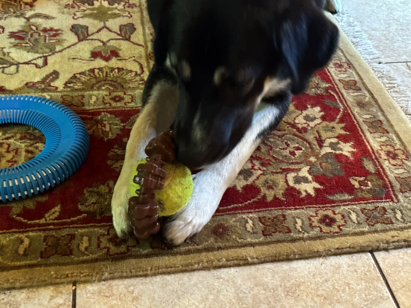 I outsmarted Asher by squeezing food pellets between his Kong ball and a circular chew toy.
