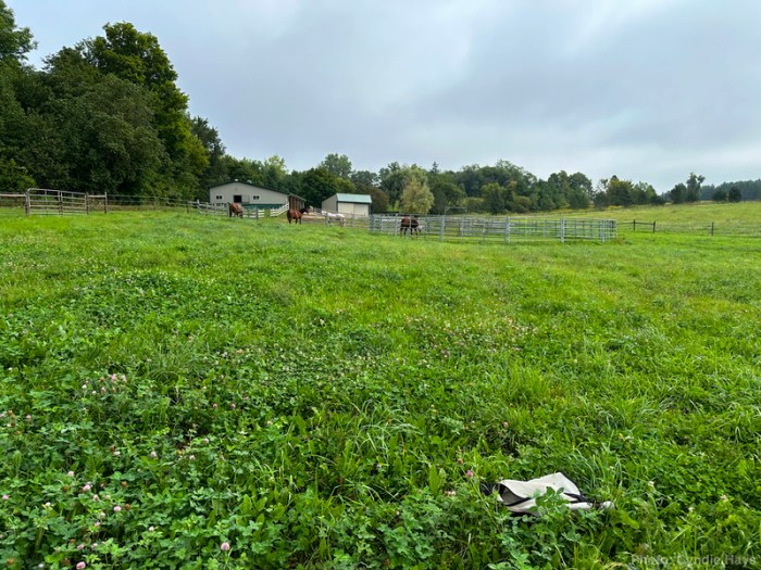 As we were walking back from rolling our trash and recycling bins to the road yesterday, we came upon Swings’ mask lying in the hay field. Second day in a row she has wrestled her way out of it. I guess she doesn’t want to have it on her head when the weather is so hot and humid. Meanwhile, Mia followed Cyndie around with a cloud of flies on her face while Cyndie was looking for the first lost mask yesterday morning. Mia was lobbying to have her mask on as soon as possible.