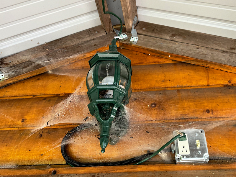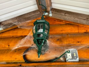 That’s where I installed an on/off switch earlier in the year but I haven’t reached up there to turn it on all summer because it never gets dark until late. When I looked up at it, finding the wasp nest was difficult through the scary-looking multi-level webs of some very industrious spider(s).