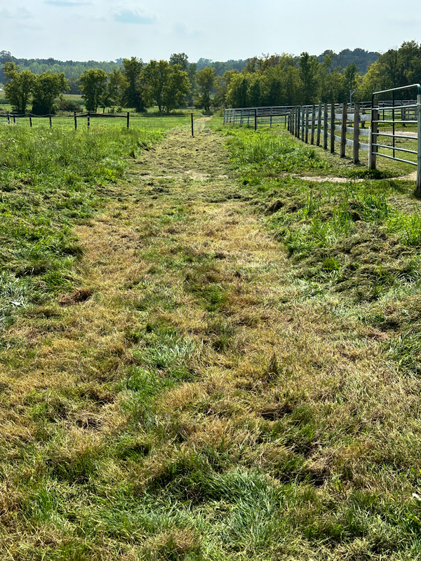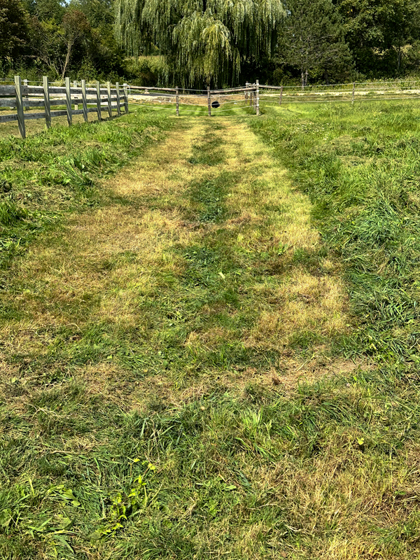 It is time to reshape the drainage swale that passes through both the hay field and the back pasture on the way to moving water off the property toward the closest river. Yesterday I mowed the area to provide a better view of the current topography and, most importantly, to clearly indicate the direct route I want shaped up for the most effective flow.