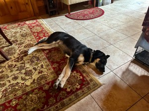 After he cooled off enough to stop panting, he and I played some “soccer” in the house with one of his squeaky Kong balls. Then he conked out for a respectable nap.