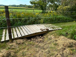 We filled a wheelbarrow with the rocks and dumped them where the ground has been washing away beneath the footbridge I built.