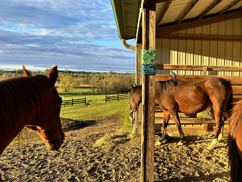 The bucket is filled with debris we were clearing out from the space beneath the barn overhang. The previous owners had stored gates, fence posts, and a bunch of firewood under there. It’s been the primary hangout space for horses ever since.