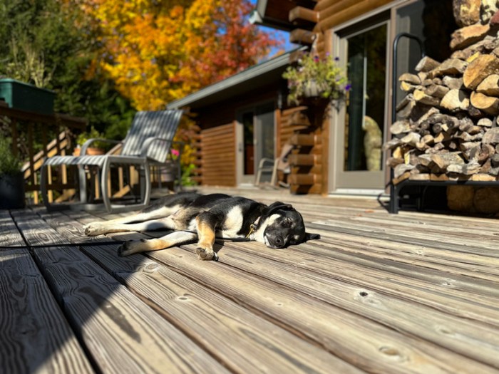 Yesterday, after the fog lifted, we lounged on the back deck with Asher tethered on a long leash. He basked in the warm sun.