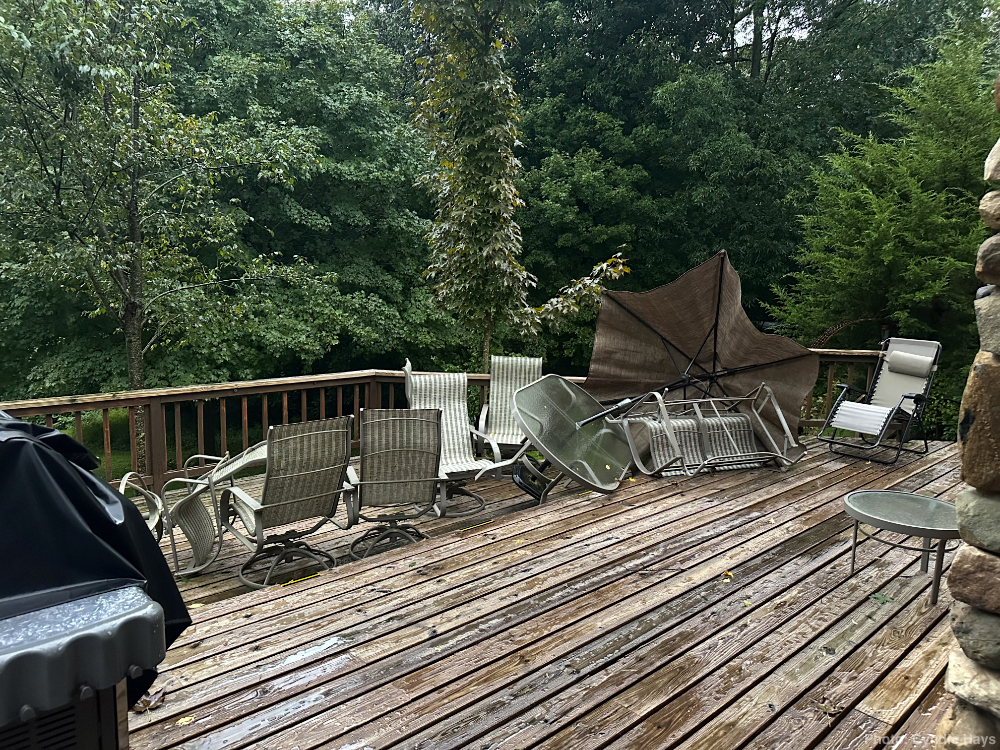A big gust of wind blasted over us just as the big raindrops came pouring down. Before I could even think about making a move, the wind was gone. We hadn’t heard a thing but Cyndie glanced out at the deck and saw our glass table with an umbrella in the middle had been tossed over along with a bench glider.