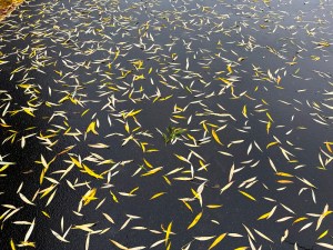 Our wet driveway near the big willow tree served up an interesting display of randomly distributed fallen leaves yesterday morning. Nature providing opportunities for digital desktop wallpaper patterns or something along those lines.