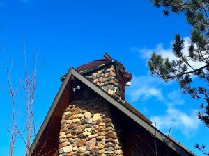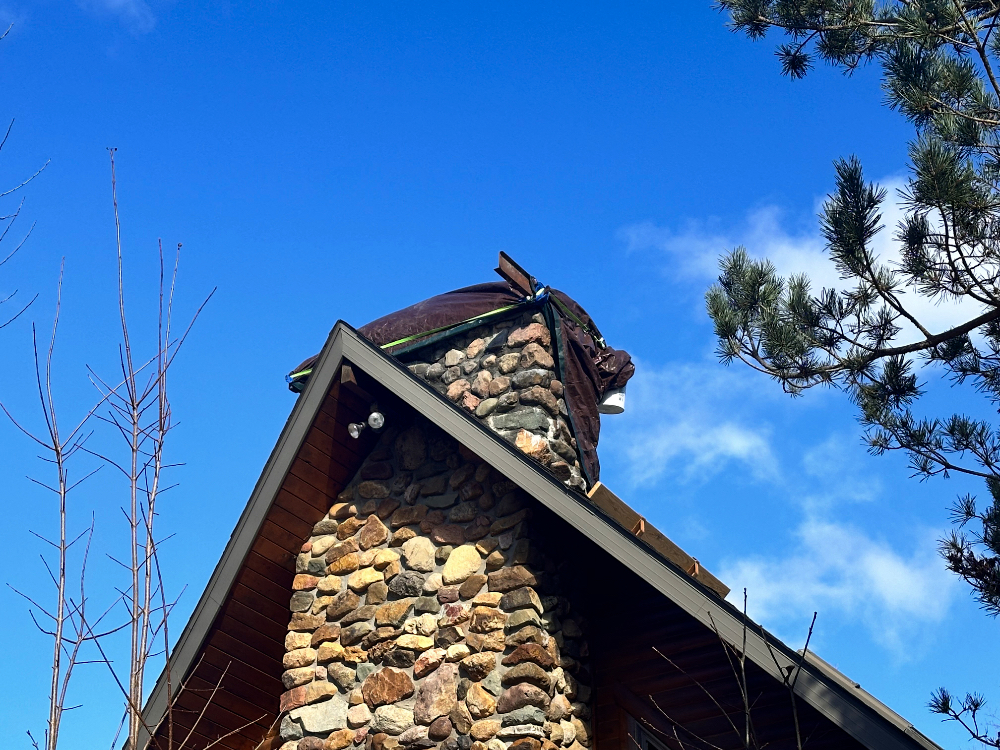 All week we have had the doors to the fireplace open along with the flue damper to allow warm air from the house to rise up in an assist toward fully curing the cement. The new crown has been covered with a tarp to keep off the rain showers we experienced yesterday.