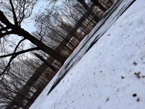 He didn’t entirely flatten the leaf; its stem remained frozen to the ground, but he disturbed the surrounding snow enough to make the scene a much less interesting mess.