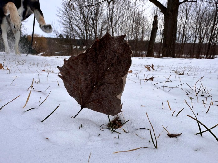 It was just a normal walk with the dog that ended in a play session in the front yard. Cyndie directed my attention to a leaf standing up on its stem in the snow. The spectacle seemed photo-worthy to me, so while she was tugging and throwing Asher’s favorite outdoor toy, I crouched low to capture the interesting phenomenon.