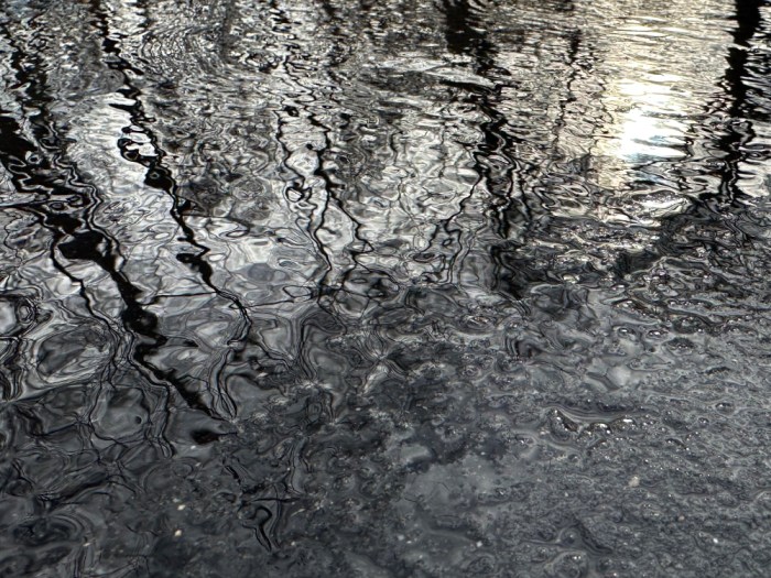 From the world of unexpected results in photography comes two images I didn’t realize I was getting at the time I captured them. There was water flowing across the asphalt of our driveway in pulses. My primary attention was on the rows of ripples showing up in the stream of flowing water and not on the way the tree branches were being reflected.