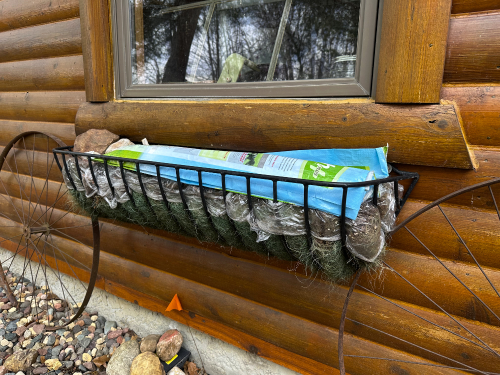 The problem we are having is that this bird seems to want to make a nest out of mud. We keep finding splatterings of dirt all over the front steps. Five minutes after sweeping the steps and landing, the dirt returns. We figured out the bird was grabbing potting soil from the planter on the garage window, so Cyndie tried covering it up.