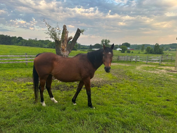 Last evening, someone was riding a horse along the road at a slow, clop-clop pace, and it got everyone’s attention. Asher’s hackles went up, and he started barking with great purpose. While the other horses retreated to the small paddock, Mia did the opposite and headed all the way to the fence line along the road for a closer inspection.